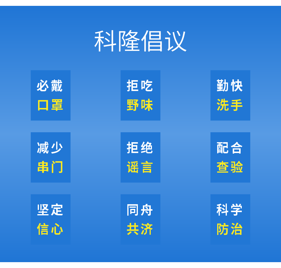 河南科隆新能源股份有限公司總經(jīng)理程迪表示:“疫情爆發(fā)以來,我們時刻關(guān)注疫情發(fā)展動態(tài),想為抗擊疫情承擔(dān)一份責(zé)任,獻(xiàn)出自己的綿薄力量!同時,我們也將落實國家相關(guān)要求,全力配合疫情防控工作,在公司內(nèi)做好消毒、疫情防控宣傳工作,密切關(guān)注假期期間員工健康情況,為共同抗擊疫情貢獻(xiàn)力量?!?/span>